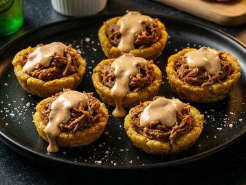 Seis patacones crujientes en versión “remix”: carne sazonada con toque cremoso, pulled pork jugoso en salsa BBQ, y pollo fresco coronado con pico de gallo. Una mezcla de sabores que se disfruta como un buen cover: diferente, sabroso y perfecto para compartir mientras se arma el karaoke.